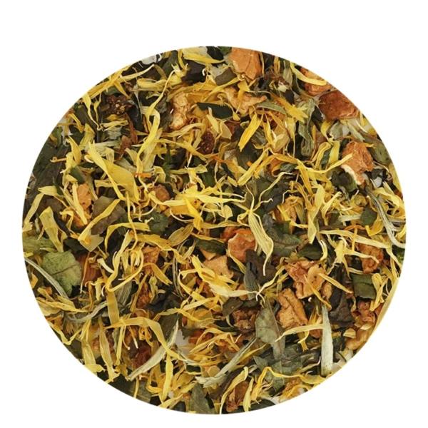 - Indhold: Æblestykker, hvid te(23%), morgenfrueblomster(8%), passionsfrugt aroma, kandiseret papaya(4%)(Sukker, papaya, konsistensmiddel: calciumchlorid, surhedsregulerende middel: citronsyre)
